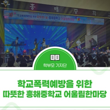 - 청명한 가을 날 10월 21일 화, 학교폭력예방을 위한 따뜻한(溫) 흥해중학교 어울림 한마당이 열렸습니다. 흥해중학교는 학력 향상과 학교 폭력 제로라는 목표 아래, 특히 선후배 간의 바른 관계를 만들기 위해 힘쓰고 있다고 하는데요. 이번 제4회 어울림 한마당을 통해 목표를 실현하고 나아가 지역민들과 어울려 소통하고 즐길 수 있도록 마련된 자리입니다. 오늘의 행사를 위해 준비해 주신 선생님께 인터뷰를 요청했습니다. Q. 안녕하세요? 오늘의 행사는 어떻게 진행되는지 안내 부탁드립니다. 이번 행사는 지역의 초등학생들과 함께 다양한 부스 체험(1부)과 어울림 음악회(2부)를 진행하는 행사와 어울림 콘서트(3부)를 운영합니다. 학생.......